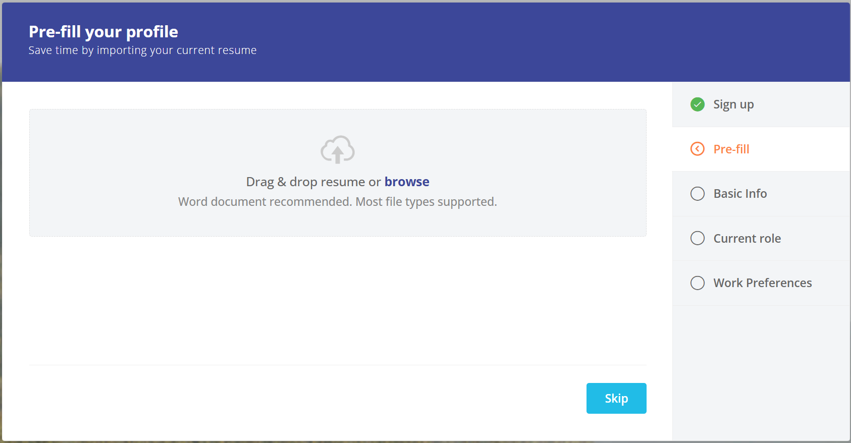 As part of building your new profile, you'll upload a resume that can be used to pre-fill the work history on your profile.