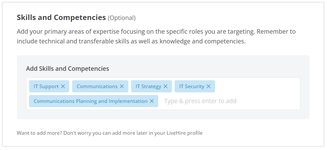 Optionally, you can tell us a little more about your strongest skills and competencies (this can also be done later in your profile)