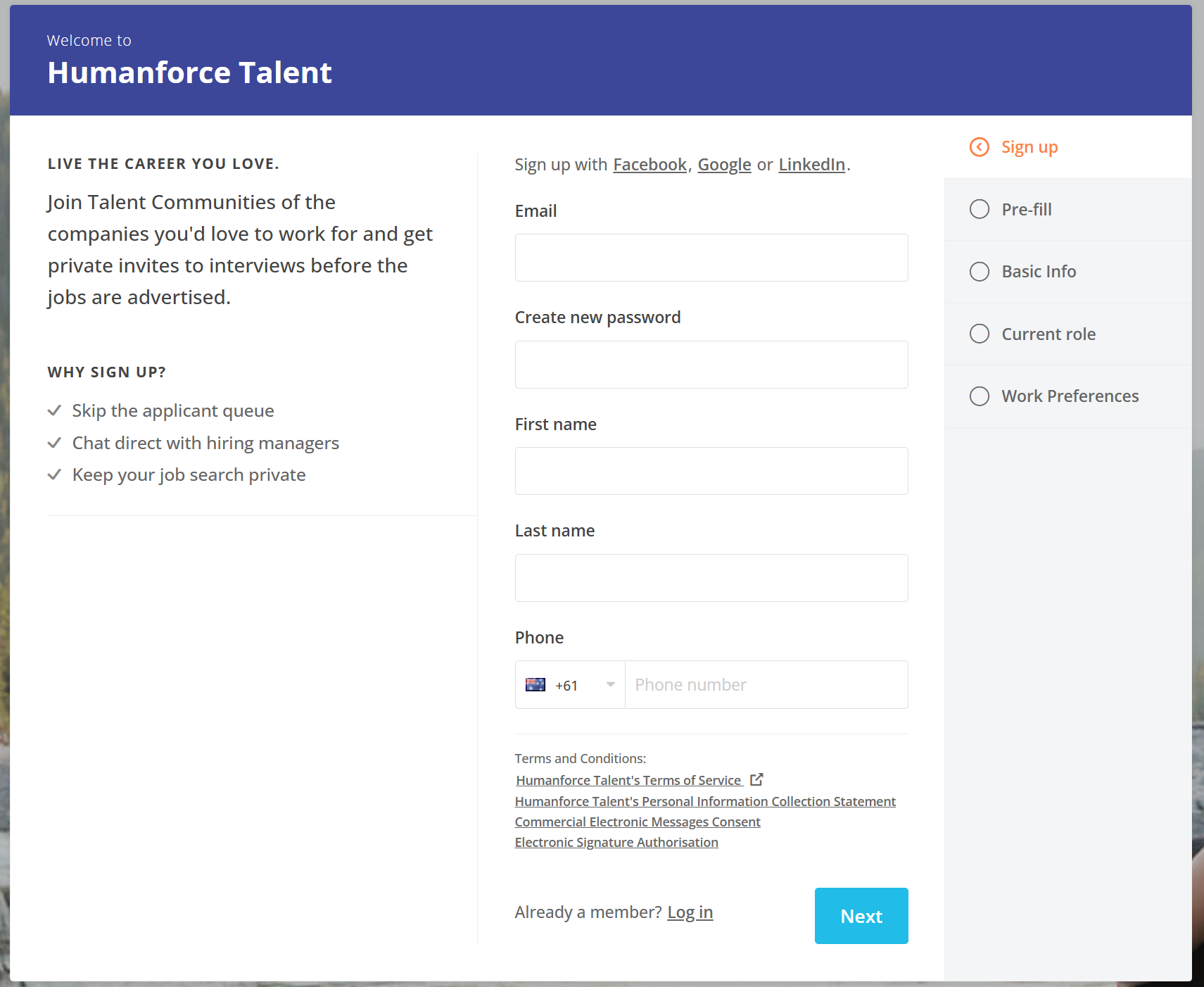 When creating a new profile you are able to sign up using Facebook, Google, LinkedIn or by using an email as shown below.