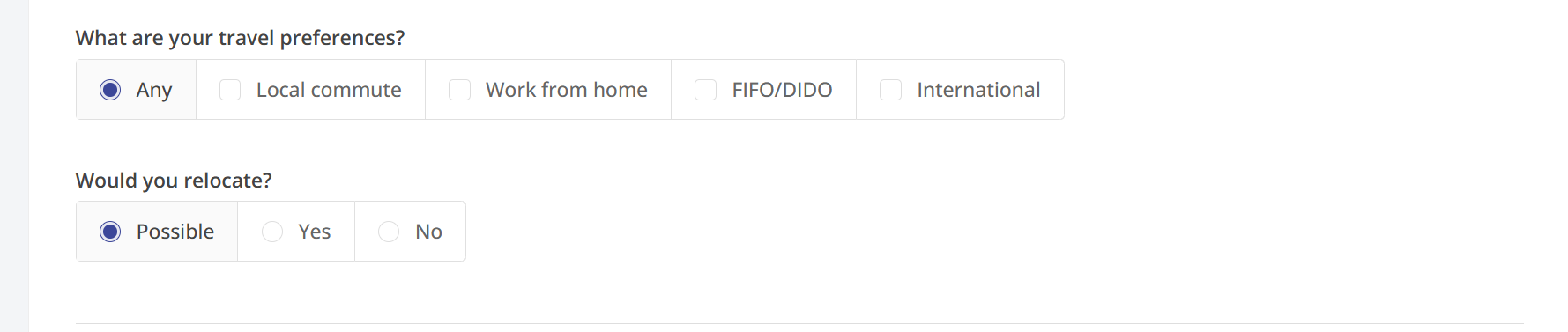 Some roles require travel or a recruiter may have a potential role that is not in your area. These fields provide information on what types of travel you are open to.