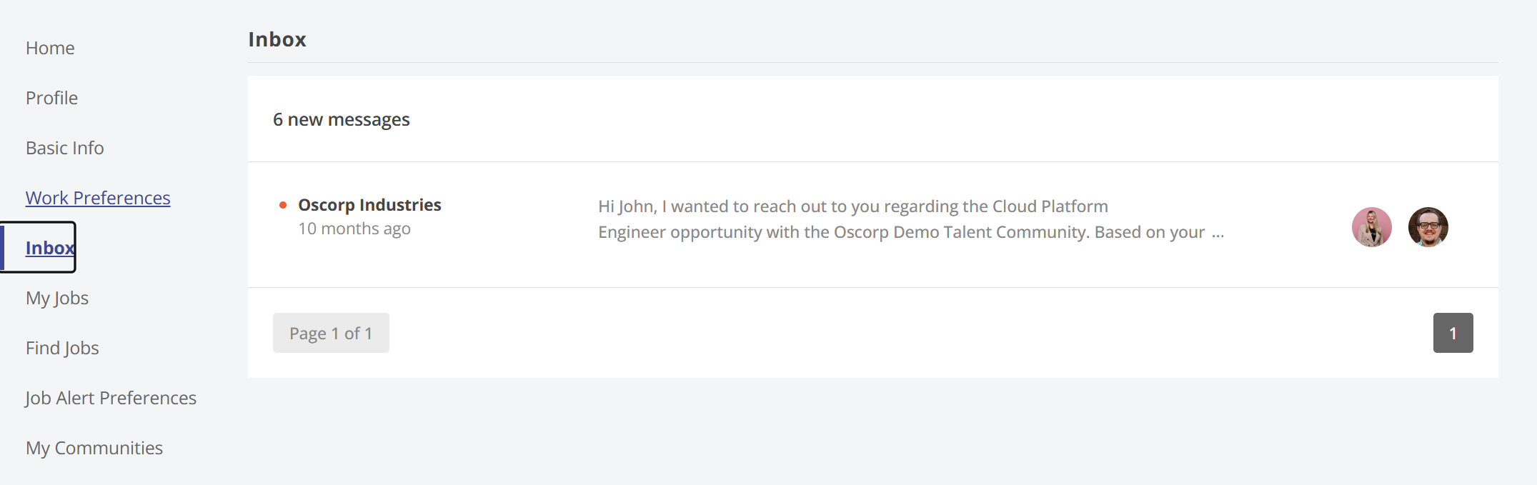 Through the Humanforce Talent Inbox, you can maintain your communication with recruiters from any of the communities you are connected with.