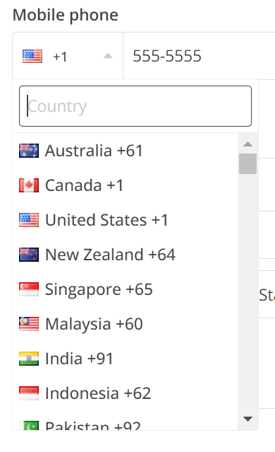 To change your mobile phone location, click the flag drop-down on the left of the field, you can select or search for the correct country.